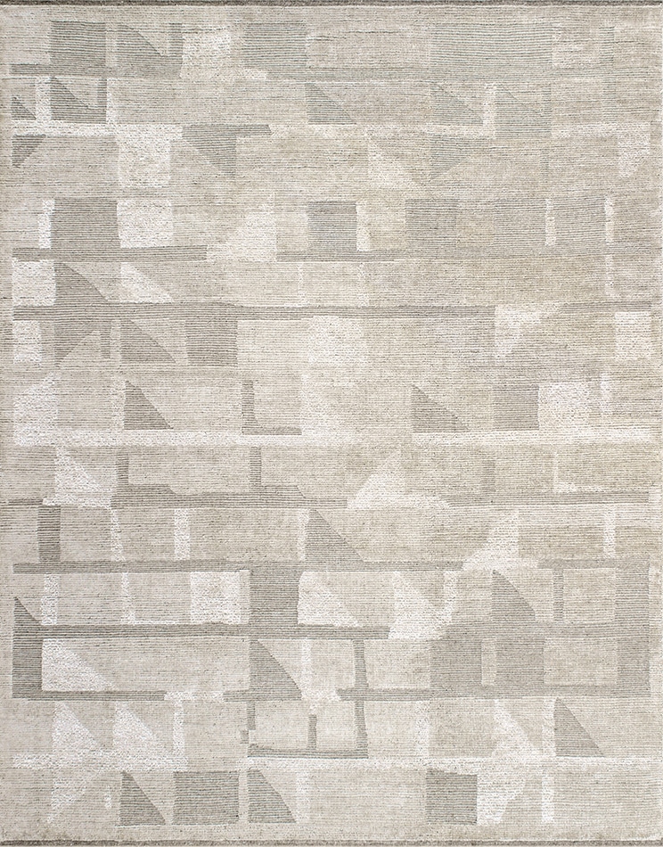 Alfombra nueva de diseño que combina geometrías y colores, anudada a mano en lana de rica y suave textura, de para ambientes modernos y únicos.