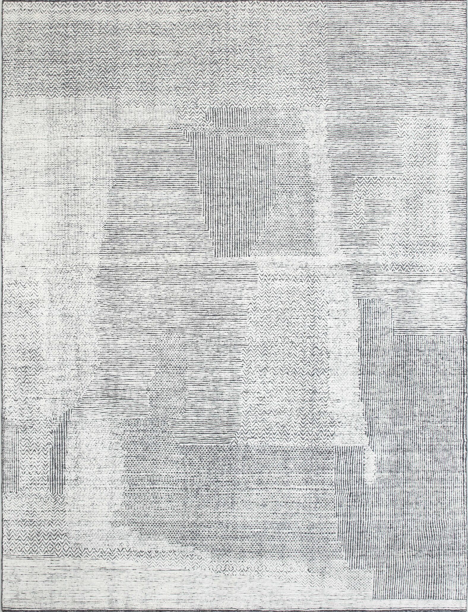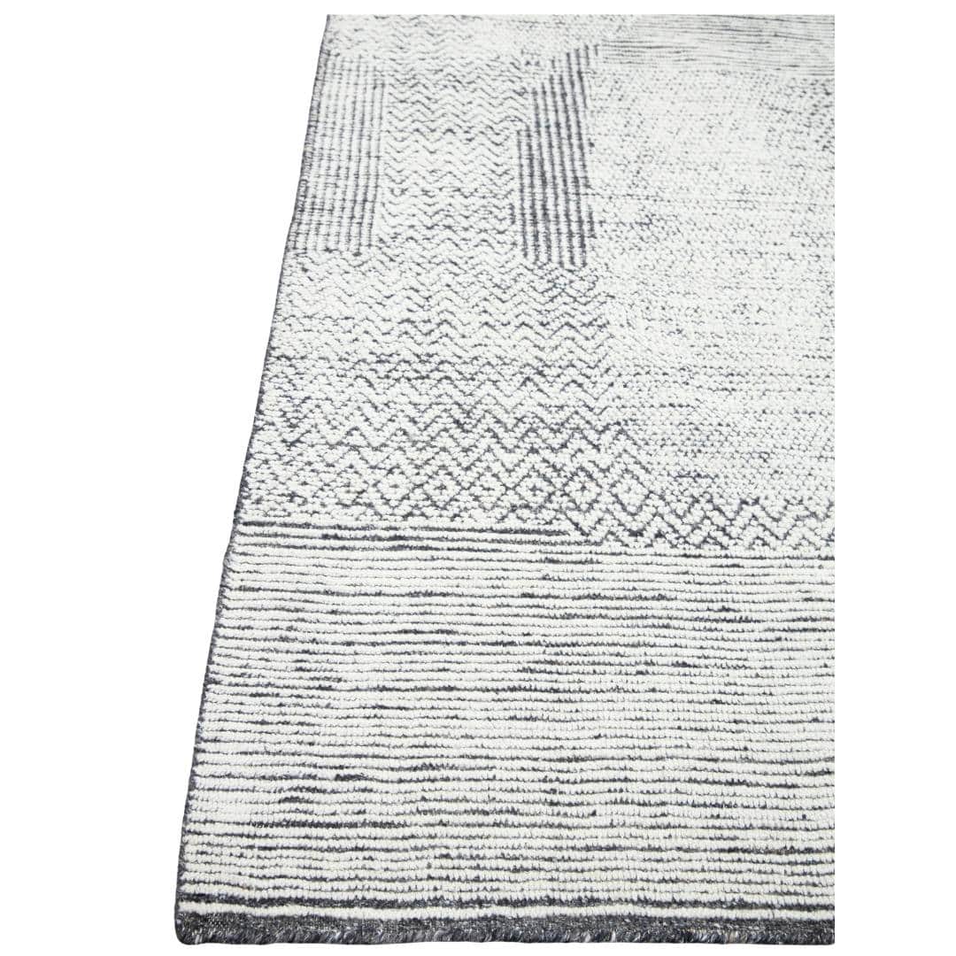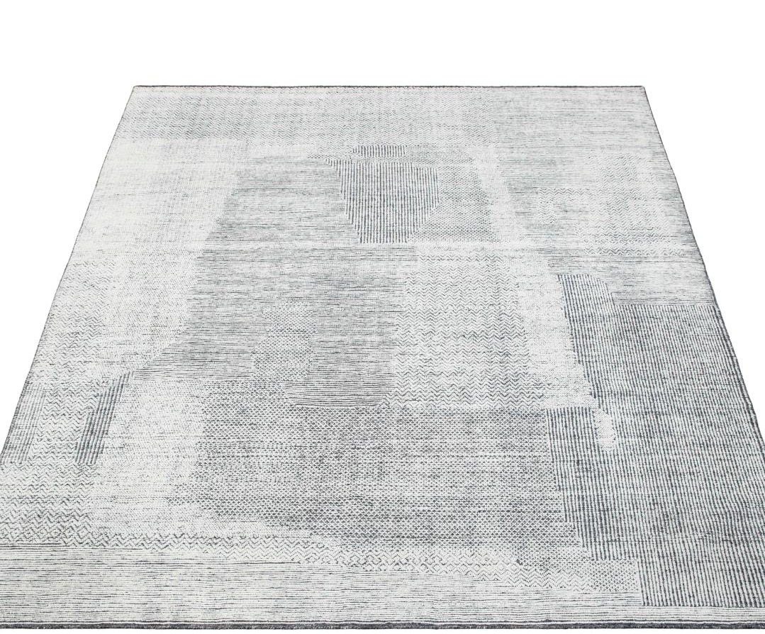 Alfombra anudada a mano, de diseño aparentemente simple, minimalista, de color neutral, pero de gran sofisticación en los detalles que dejan un extraordinario acabado final, con una superficie tallada con relieves de altos y bajos.