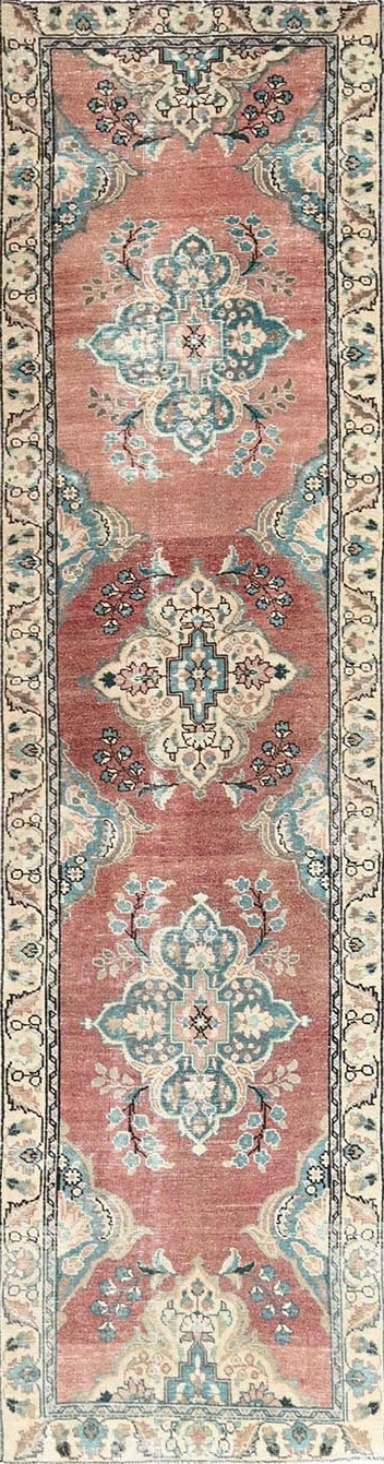 Alfombra persa de entre 30 a 60 años que se encuentra en buen estado y que ha perdido la intensidad de sus colores originales luego de sucesivos lavados y secados al sol. Esta decoloración en la alfombra da un look contemporáneo, y las marcas de desgaste son real testimonio del paso del tiempo.