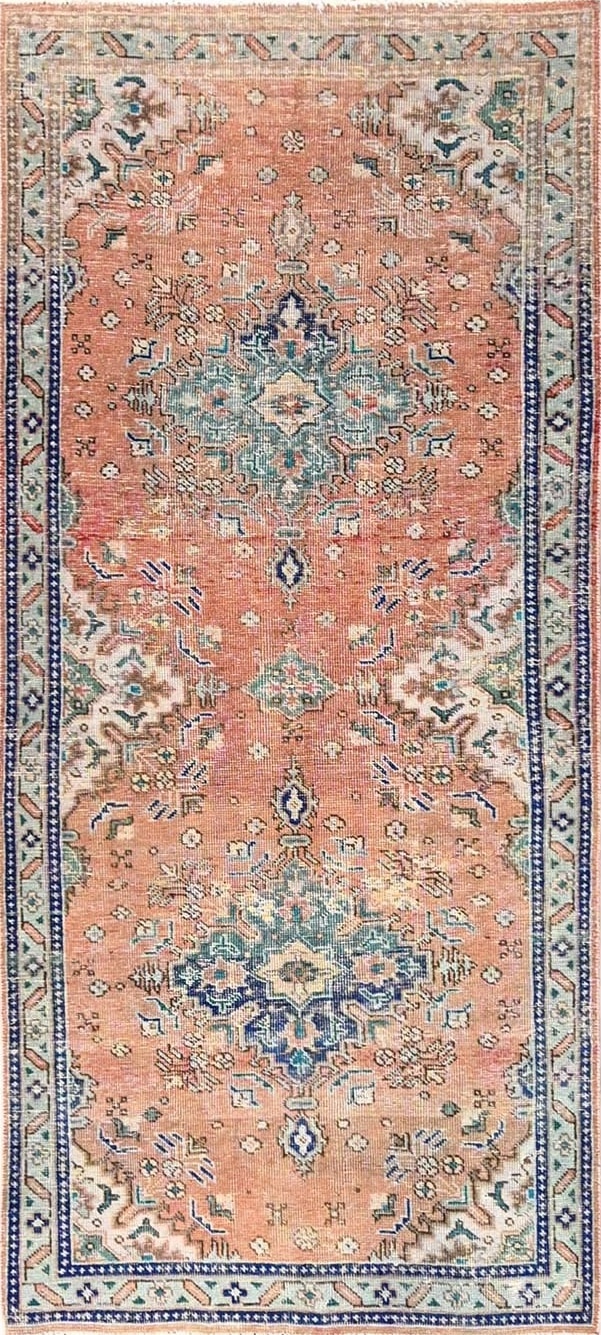 Alfombra persa de entre 30 a 60 años que se encuentra en buen estado y que ha perdido la intensidad de sus colores originales luego de sucesivos lavados y secados al sol. Esta decoloración en la alfombra  da un look contemporáneo, y las marcas de desgaste son real testimonio del paso del tiempo.