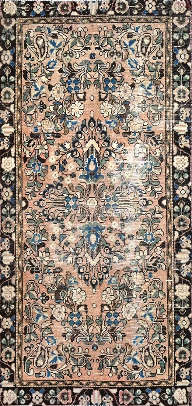 Alfombra persa de entre 30 a 60 años que se encuentra en buen estado y que ha perdido la intensidad de sus colores originales luego de sucesivos lavados y secados al sol. Esta decoloración en la alfombra  da un look contemporáneo, y las marcas de desgaste son real testimonio del paso del tiempo.